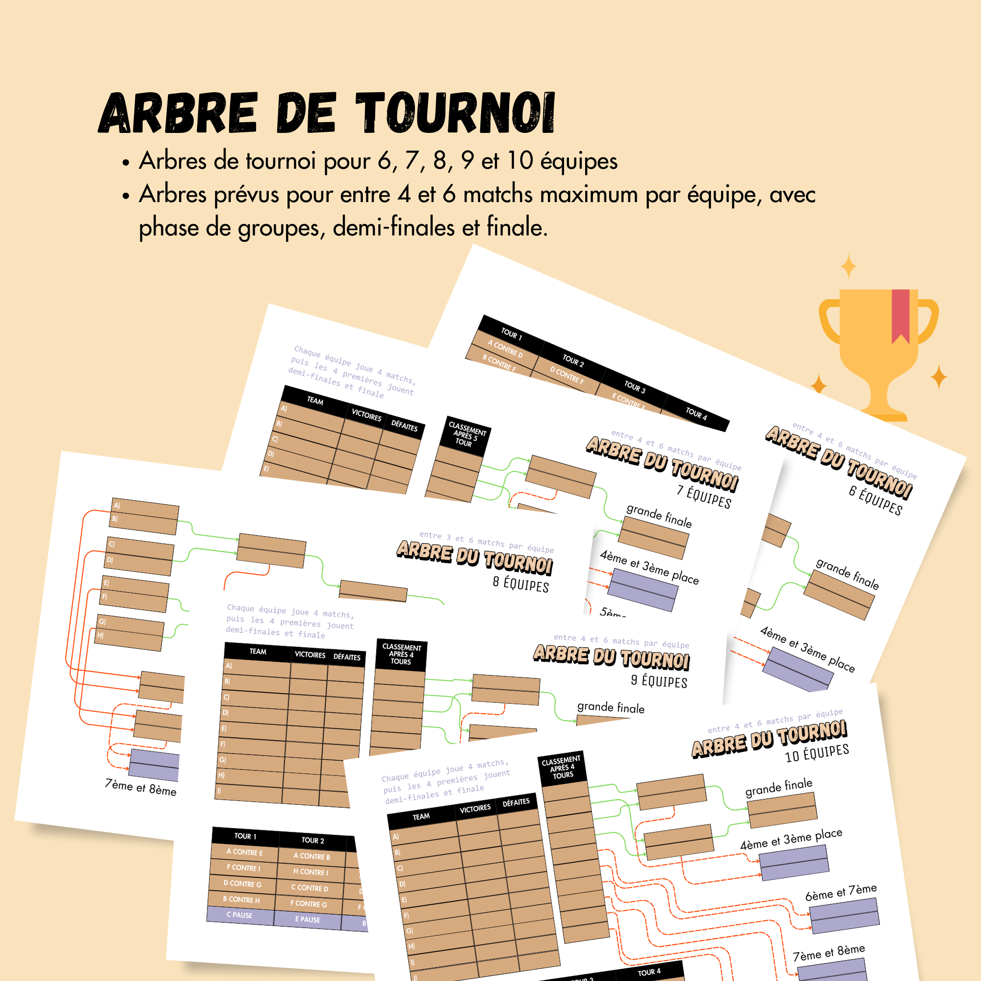 - Des astuces pour installer et gérer ton événement comme un pro, de l’emplacement des tables de ping à l’organisation des matchs. 5 arbres de tournoi sont inclus, pour équilibrer au mieux le nombres de parties par équipe.